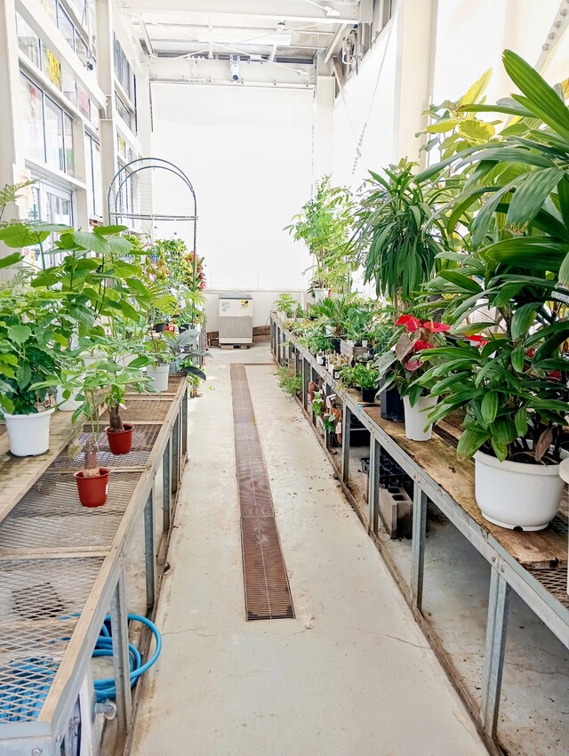 柔らかな日差しが降り注ぐ大きな温室のような建物内には花々と観葉植物コーナーが。