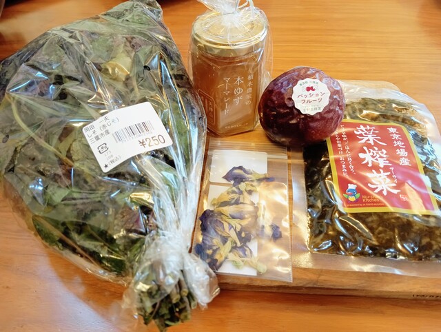 前から気になっていた「天神山須藤園」の柑橘ジャムやオリーブを使った食品、そして「森屋農園」のバタフライピーのハーブティーがありました。