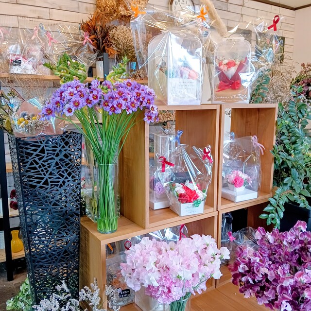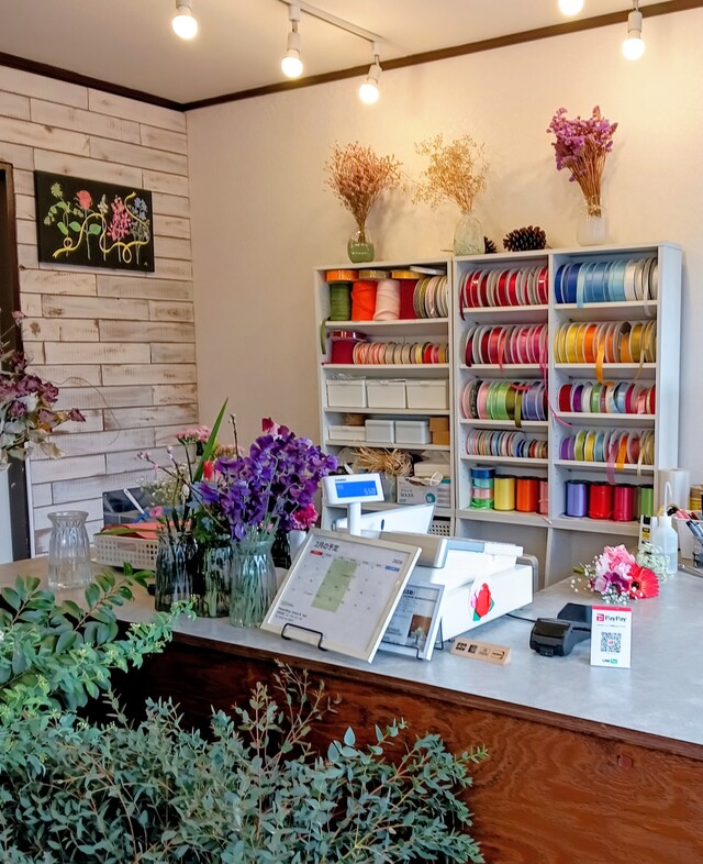 店内に入ると、色とりどりの花々が並び、ラッピング用のリボンが整然とディスプレイされています。