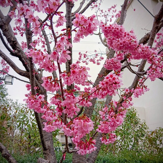 帰りに近くの広場を通ると、早咲きの桜が咲いているのを見つけました。
